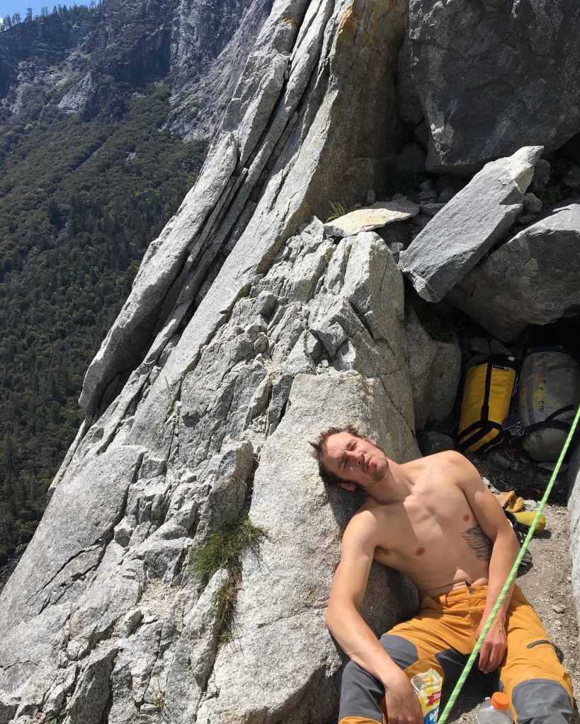There had been thunderstorms predicted around 2 pm, so we got below the roof and pitched our porta ledge. We Kept the fly close by, but left it off, thinking the roof would protect us. We then set up and had lunch, enjoying the view. This is what big walling was supposed to be. Hanging out on the ledge, beautiful weather, and wonderful daytime views. We talked about the journey that brought us here, how we were so close to the summit, and not jinxing ourselves. We were able to briefly get service and found that the rain that had been in the forecast was gone, and that the rest of the day showed clear. We were slightly annoyed to have pitched the ledge for nothing, wasting 3 hours of our day, but also glad for the positive experience in the ledge, hanging out and relaxing.