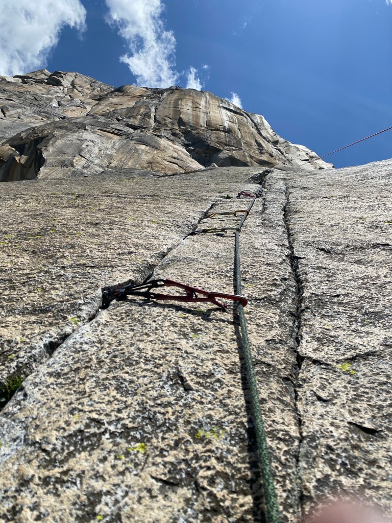 After cleaning the dihedral pitch, I got started on pitch 24, perhaps my favorite of the route. This pitch is graded C3F or A2, but honestly, I just found it to be C3 fun. This pitch was two straight in cracks that allowed me to get high in my aiders on every move and felt more like climbing in zion but on granite. I do remember there being a short section at the top that was moderately challenging, but with an entire pitch of bomber gear below you, it didn’t feel very intimidating. I loved every second of this pitch. Looking back, perhaps my body was just feeling rested after the day off and everything didn’t hurt as much. Whatever it was, I had a blast.