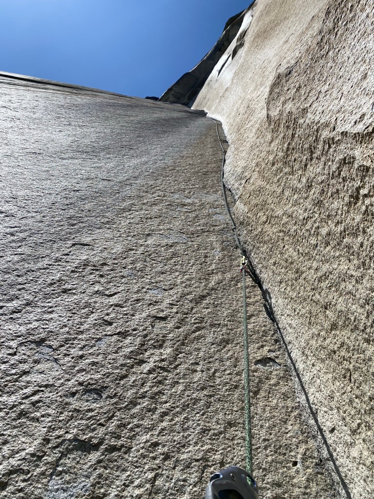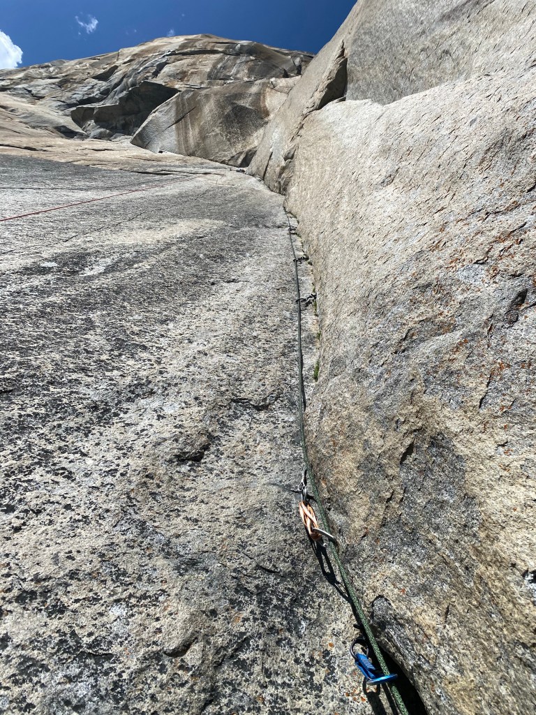 I woke up just staring up at that second pitch for the day, slightly terrified, but not sure why. The thing was just so damn intimidating looking. I knew it was what I could expect for the entire upper third of the route. Beautiful thin corners were what the Muir Wall was all about. First I had to tackle Pitch 15, a non-descript C1 that looked fairly chill, and it was. Minus a softball-sized rock that broke off inside the crack and tumbled below it was fairly uneventful. I just hoped that rock didn’t hit anybody on the way down. I didn’t hear about any major injuries occurring so I’m going to assume it all ended ok.
