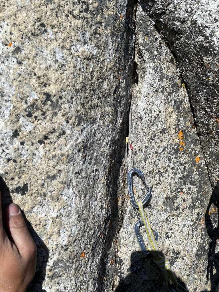 I reached a place where I thought I was going to need another beak (a medium-sized one this time) and once again I hand placed it. As I went to weight the beak it ripped out of the rock and hit me right on top of my helmet, causing me to sink back on my fifi hook and the tiny piece it was attached to. I continued trying to hand place it several more times but was unable to get it to stick, continually ripping it out of the rock and weighting my fifi hook on the piece below. I looked up and thought I saw a bigger placement not far away, but just couldn’t get to it. In hindsight, I could have fashioned a cheat stick with my hammer and tape and made that placement, however, I didn’t think of it at the time and I opted to give the beak a few taps with my hammer, eliminating my opportunity to climb this wall free. I stood up and the beak held like a champ, allowing me to reach up and place a bomber gold DMM Offset that I would trust my life to. From that placement on the crack remained slightly challenging, but the real difficulties were over. I ended up falling one placement short of pulling off the pitch clean, but I had fun and I learned a lot.