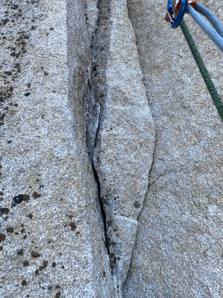 Pitch 14 was the first time I found myself somewhat scared by the climbing itself. Pitch 14 seemed to be nothing but .1/.2 offsets, and I only had 2 on me at the time. I had brought the third set of offsets as a backup set in case I dropped some, but after this pitch, I just started bringing all 3 sets on each pitch. I was using multiple camhook moves between the occasional piece that wasn’t .1/.2’s. This pitch is an inset with both a right and a left side. I started on the right side, and later in the pitch had to transition to the left. But first, a freak rainstorm came in, hard and fast. I was only in my sun hoody at the time. With no weather in the forecast, I had left all my jackets and rain kit down at the belay. With the small gear and camhooks, I was unable to build an anchor I was comfortable with and rappel back to the anchor. The rain/hail was not letting up and I was beginning to shiver uncontrollably, the spiciness of the pitch itself compounding with the weather. I wanted to shut down and stop moving, but the desire to get into some warmer layers forced me to keep moving up. At least if I fell, I could lower back to the belay off whatever caught me and get warm. I borrowed the new BD 00 cam from my friend Perry before I left, and was sure happy to have it numerous times on this route, this pitch included. Eventually, I reached a section in the crack where it finally opened to a much larger size. I threw in three good size pieces, sequentially cloved all 3 with my haul line, and rappelled back the anchor. In the Erik Sloan guidebook, he mentions that the cracks on the Muir turn into a waterfall in a storm, and I got a chance to see this first hand. My hands had numbed out and I was soaked.