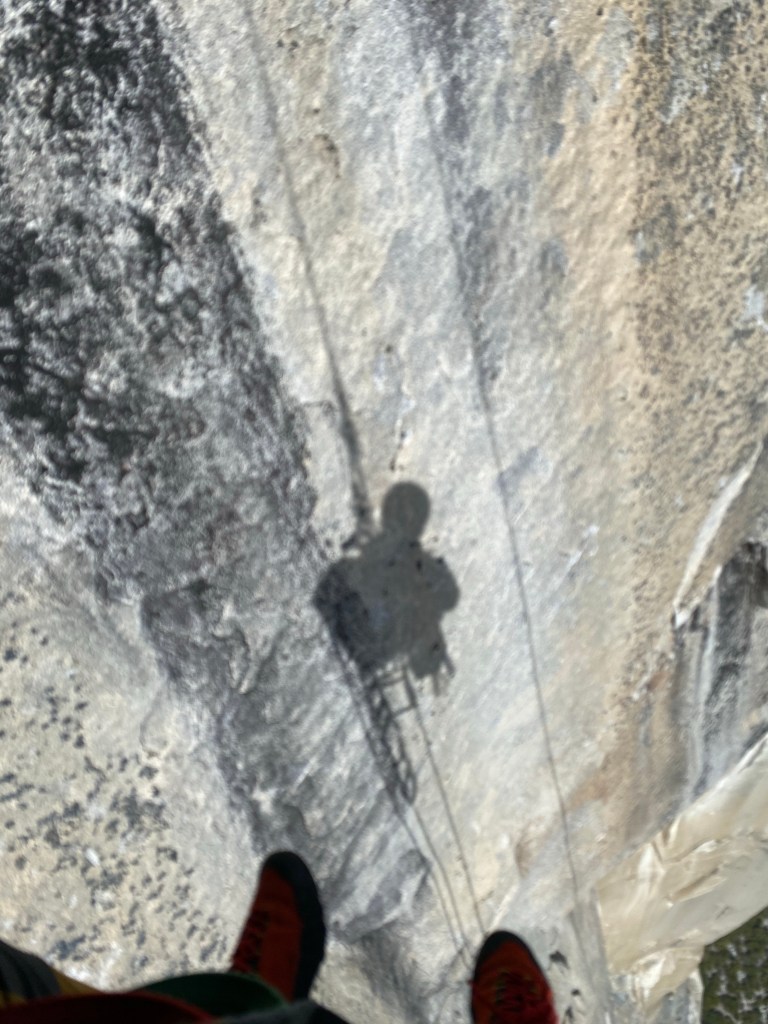 I did free climb pitch 2 however. The topo says 5.8 but I thought it was mostly 5.6 with maybe a small section of 5.7 or maybe 5.8. I felt very comfortable free climbing in my approach shoes, with the gri-gri belay. When I did get to the short section of steep hand crack, I couldn’t help but smile ear to ear. I was free climbing on the Captain by myself. Pretty cool place to be.
