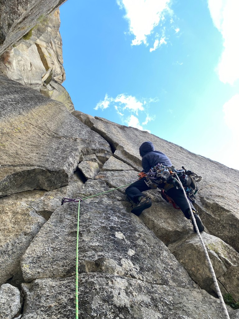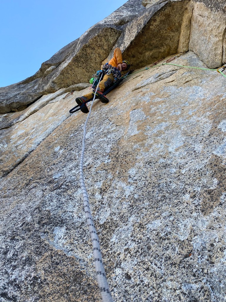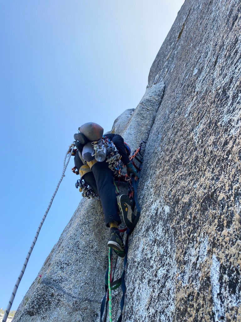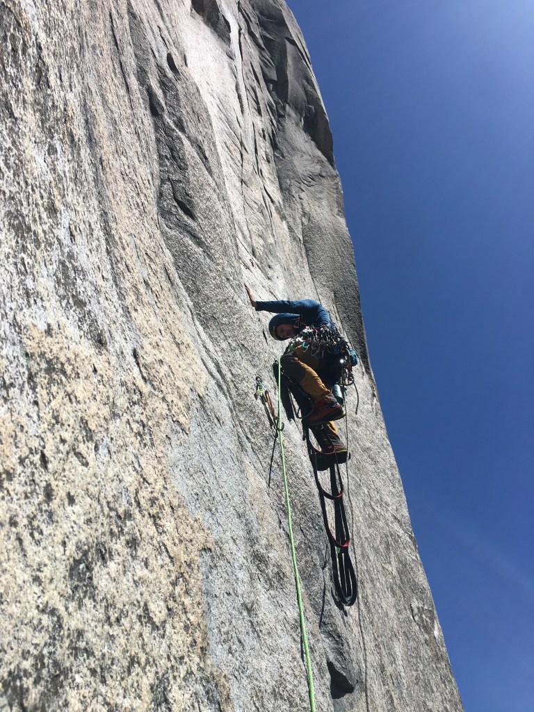 Clay and I continued to swing leads as I did pitch 4, Clay 5, and I did 6. I remembered pitch 6 as being one of the most aesthetic on the route, having watched Jon climb it last fall. As I climbed up, I thought back to how terrible I was at aid then, and how much I’ve progressed since. Nearly top stepping every single move I felt like I cruised through the pitches that I once found so daunting. It was very satisfying to recognize that progression and to see all my hard work paying off.