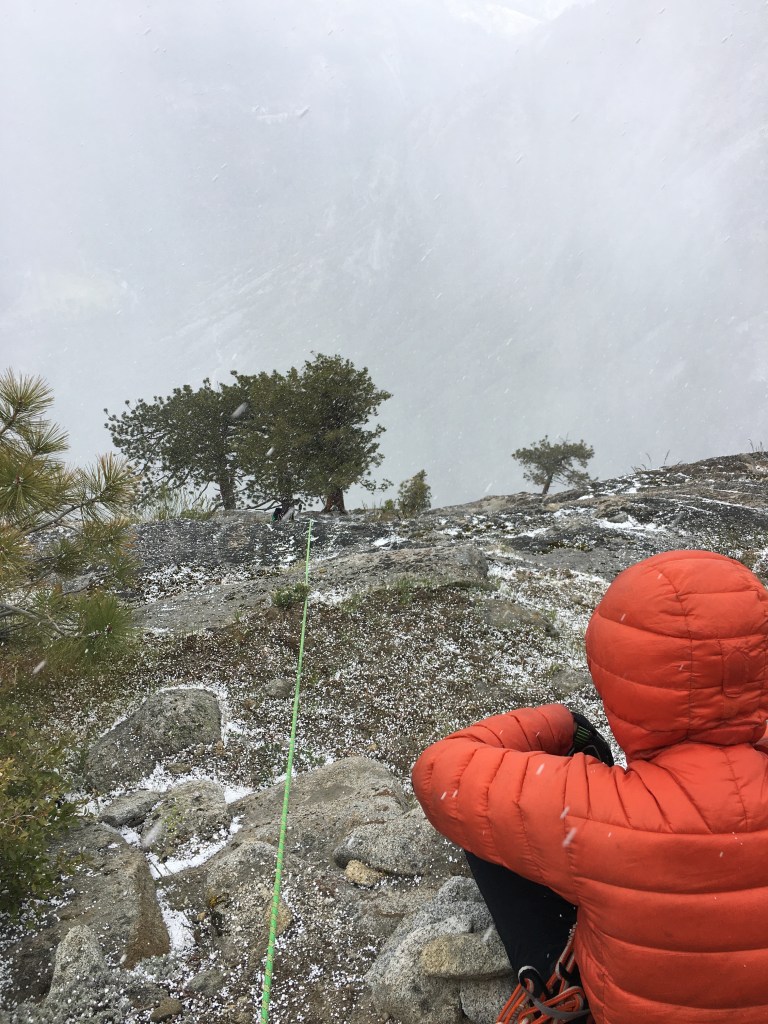 The snow was a blessing in disguise as it kept us from actually getting too wet, and while the slabs did get a little wet, they weren’t completely soaked. After an hour or two we finally made our way to the summit of the route and began our long descent. The weather let up once we hit the top, and stayed away until we made it back to the ground. While, I still wholeheartedly think the decision to leave Thanksgiving Ledge was a poor decision, it ended up working out and I’m glad that decision was made. We put ourselves in a bad position and gambled with fate a little bit, but we got lucky and made it down for some delicious pizza in Curry Village.