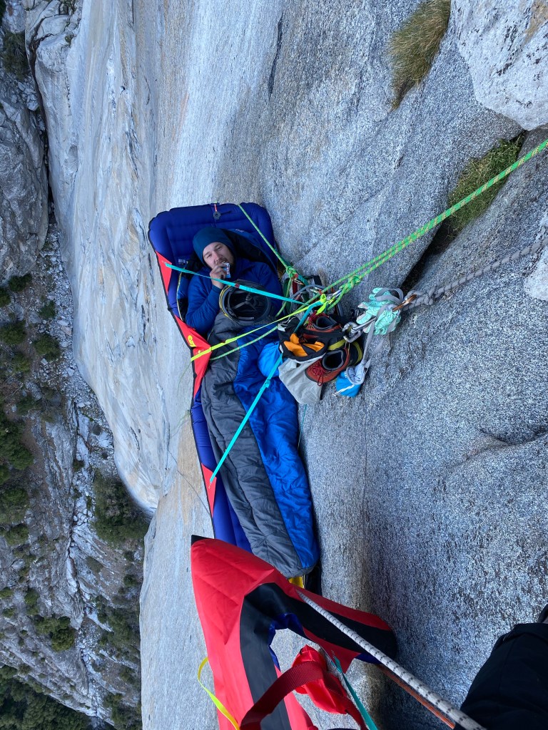 The top of Pitch 6 was our intended goal for the night. It would be a hanging belay, and I knew that belay had more bolts than most on the route. This would allow us to better organize our sleeping situation to make things as comfortable as possible. Clay was dreading the hanging belay, but it all worked out. Clay and Steve positioned their pods next to one another. They didn’t set it up perfectly, and Steve’s pod ended up making a V leading to a night of slight discomfort for him. I lowered a rope from the belay and anchored my ledge into a knot several feet below theirs. Steve was continually anxious about when, where, and how he would pee on the wall. Once I was below him, Steve had made up his mind he would not be able to pee that night, resigning to turning his nalgene into a pee bottle. I urged him to pee off the ledge, but he was concerned that he would pee on me. Eventually he did pee off the ledge, and to be completely honest I did catch a little spray. That’s just how it goes on the Big Walls.