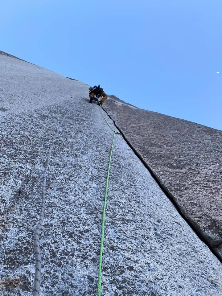 We continued up the route, Clay and I taking over the leading while Steve focused on the other vital tasks during the ascent. Clay did pitch 2 and I carried on with pitch 3. I thought back to when Jon and I climbed Lurking Fear. It felt like it had been years, but it was only a mere 7 months ago. As I climbed pitch 3 I tried to talk Clay through how he would need to use the gear I left behind to back aid a traversing section below the window pane flake. Clay doing normal Clay things ultimately took the last piece out and just went for a swing out of the roof as opposed to back aiding it. I wasn’t terribly surprised.