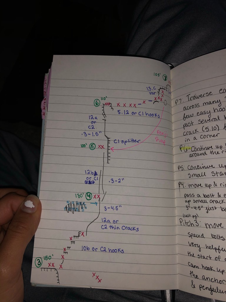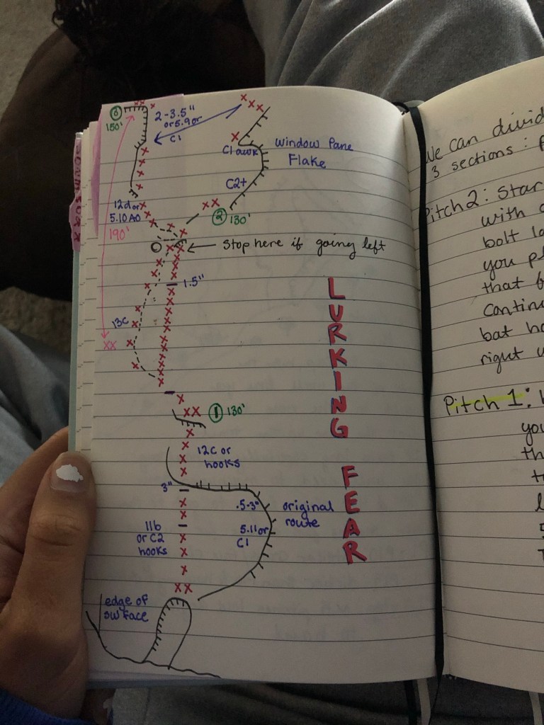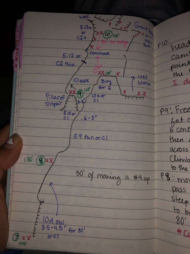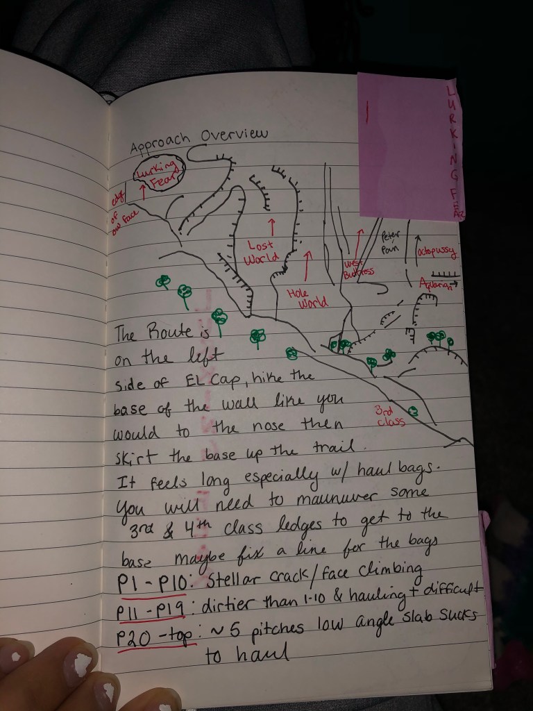 I met the Schwinger crew in Morrison after finishing a shortened night at work. Clay jumped in the car with me and we followed the other 3 as we drove from The Front Range to Bakersfield California, grabbing a hotel for the night. All 5 of us packed into the hotel room, and I jumped on one of their brand new G7 Pods to crash for the night. Camy showed me a notebook she had put together where she had meticulously drawn the topo for Lurking Fear, writing tidbits of beta and information she had compiled for each and every pitch. I was blown away by her artwork and her dedication to learning the route so intricately. I suggested to the group that we try and get to the Valley as early as possible, and hike up our 12 gallons of water to the base of the route, as I remembered the approach with the Pigs on our back being the worst part of the experience for Jon and I.